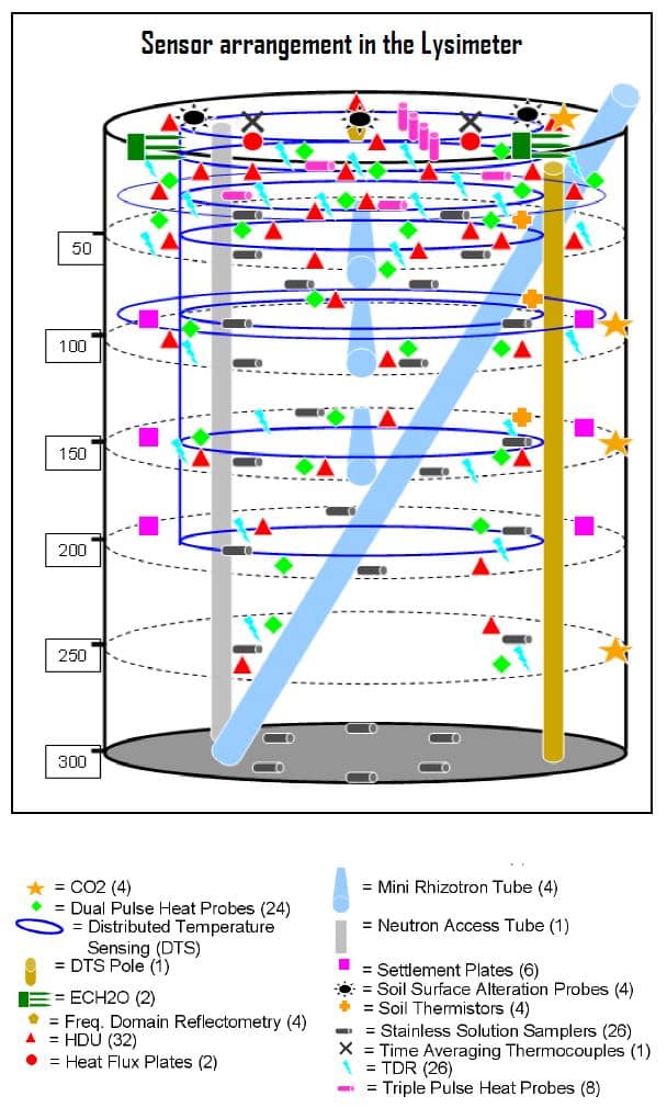 From inside a lysimeter, data such as water content, matric potential, temperature, thermal properties, electrical conductivity, soil settlement, and erosion are measured. Ports for pore water sampling and access tubes for digital imaging of soil cross sections are installed. As a special feature, a distributed temperature sensing system is also installed to obtain horizontal temperature profiles at six depths as well as a continuous vertical temperature profile.